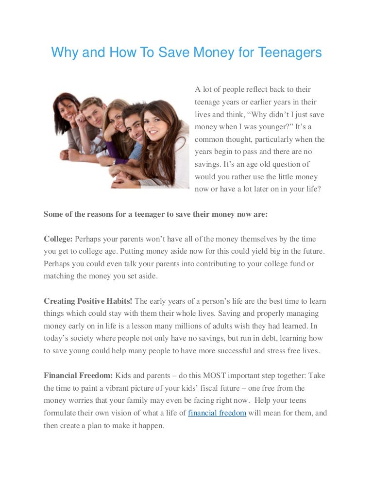 However, unnecessary expenses (such as paying for a night out with friends) are left up to us. Keeping check of your expenses of course, our parents take care of necessary expenses (food, shelter, clothes) when we're teenagers. Whether it's every day, week, or month, set saving targets and stick with them. Some reasons why teenagers should save money include things like college, retirement and for. This will allow them to control their money and start investing it.